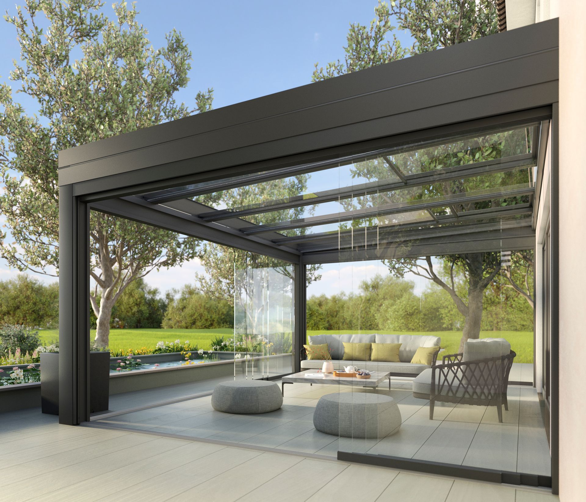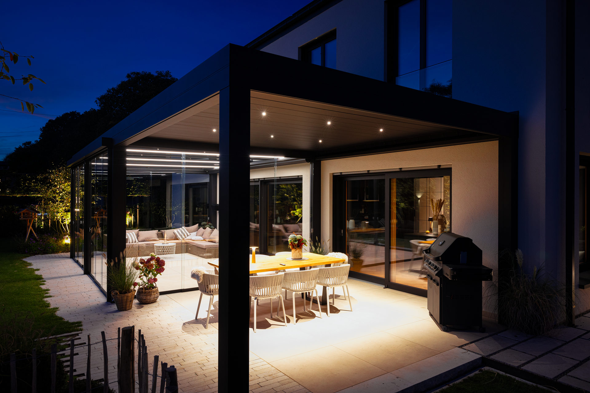 Begrüßen Sie die Sonne und genießen Sie die frische Luft, sitzen Sie entspannt im Schatten und bleiben Sie bei einem Schauer einfach, wo Sie sind – im Trockenen. Ihr Dach verändert sich auf Knopfdruck: per Fernbedienung können Sie die Lamellen drehen, öffnen, schließen. Auch eine Kombination aus einem Glasdach mit einem Lamellendach ist möglich.